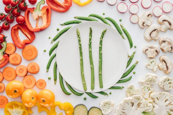 Top view of empty round white plate and organic vegetables isolated on white — Stock photos