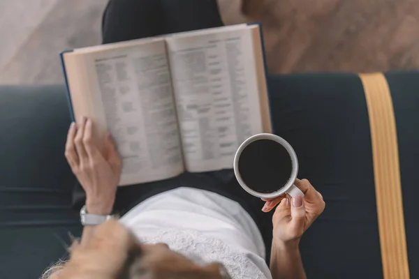 Жінка читає книгу і п'є каву — стокові фотографії